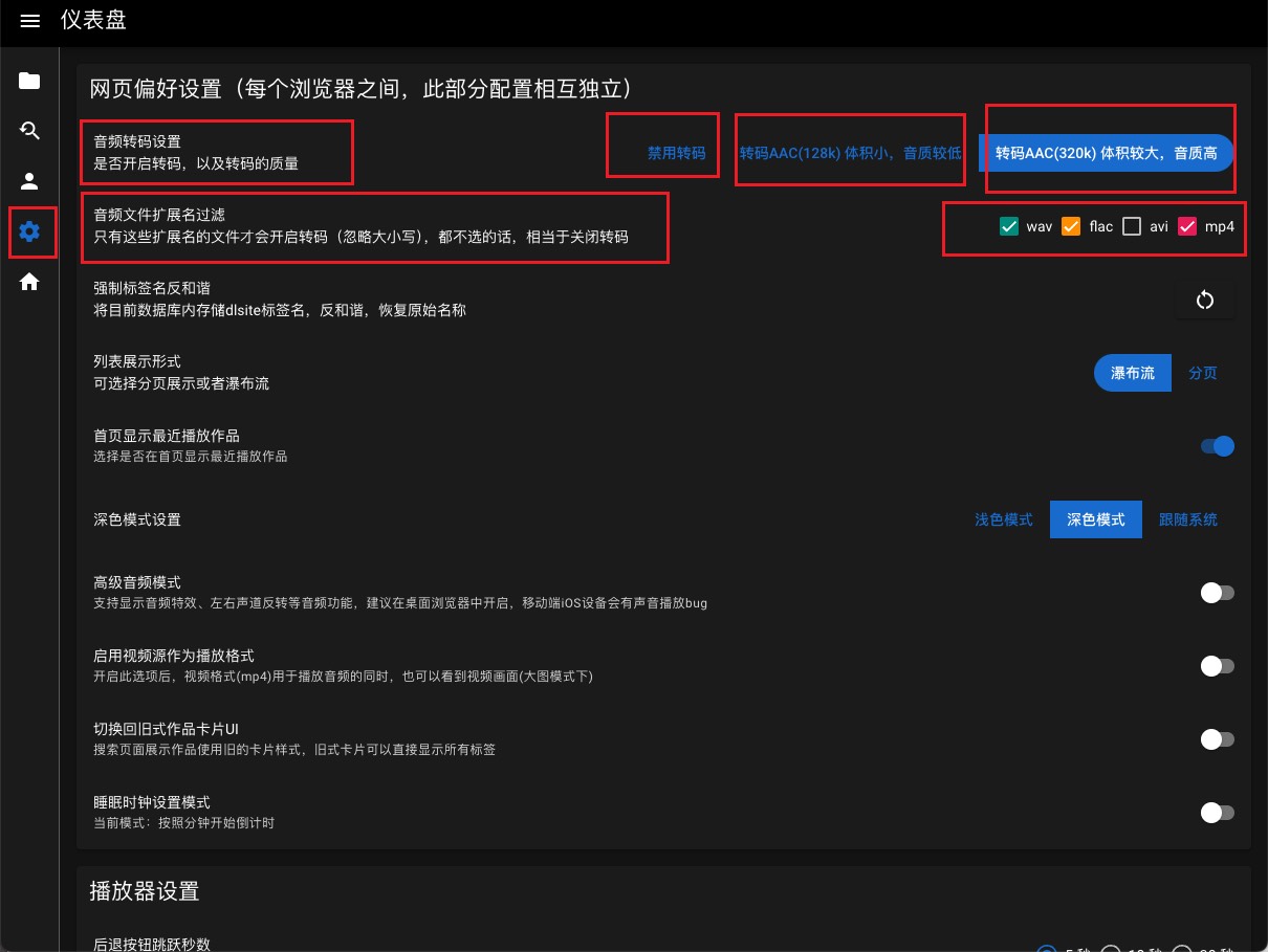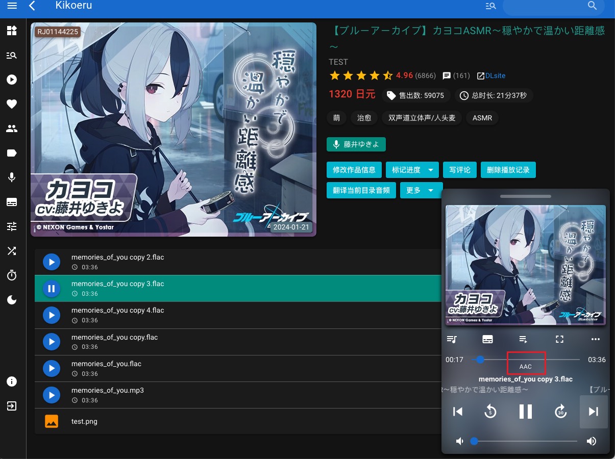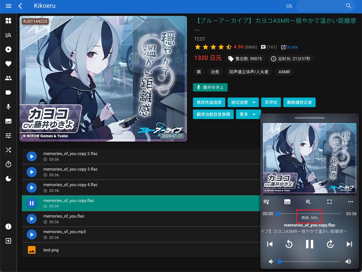镜像更新 v0.6.14-202503092025年3月9日 · 阅读需 2 分钟Number17Maintainer of dockerhub:number17/kikoeru 服务器增加aac转码功能,可针对wav、flac、avi等文件转码为体积小+可播放的音频格式 目前网页端可使用转码功能,点击文件播放时,会按照要求自动启动转码 转码完成后,才会播放音频 可选 aac 128 kb/s、或者aac 320 kb/s 转码文件缓存:转码文件缓存数量上限200,方便下次播放同一个文件时,无需等待 超过限制数量时,自动删除最久没有被访问过的缓存 当前曲播放30秒后,将会提前转码下一曲 转码选项 播放前、等待转码完成 转码完成、播放中